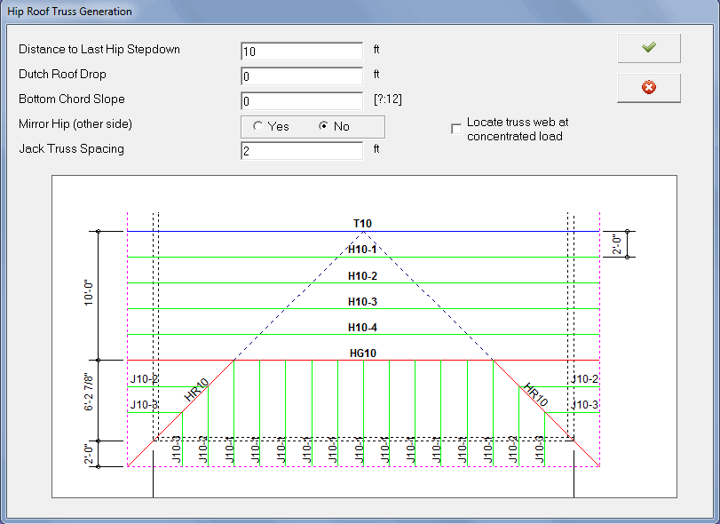 Hip-Roof Generator function automatically generates all of the hip roof trusses. It loads each truss by the roof area pertaining to each truss and places point loads (gravity and wind uplift) on the hip rafter and the hip girder trusses. After you specify the hip girder setback distance, the routine will design the complete hip roof system in minutes, identifying trusses that failed and failure reason.